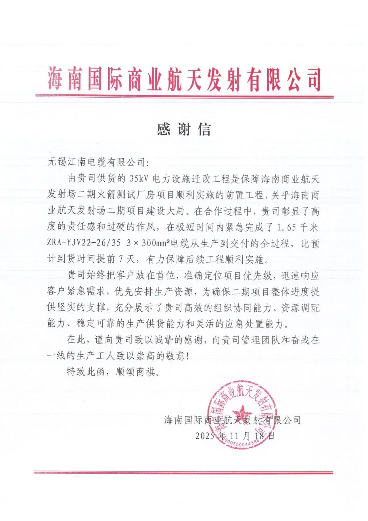 近日,江南電纜收到來自海南國際商業(yè)航天發(fā)射有限公司的一封感謝信,對公司高效的組織協(xié)同能力、資源調(diào)配能力、穩(wěn)定可靠的生產(chǎn)供貨能力和靈活的應(yīng)急處置能力,表示高度肯定!